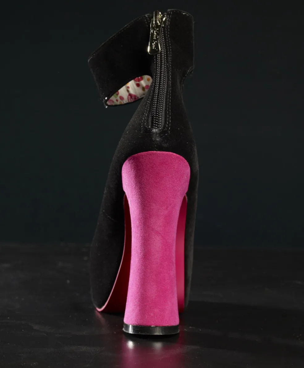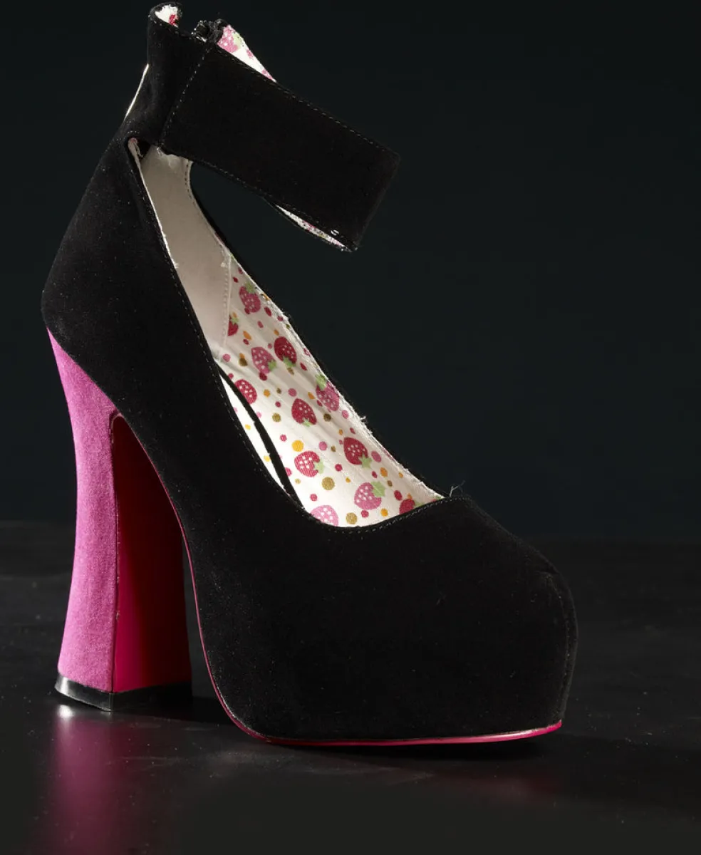 Velvet Platform Shoes With 1-1/4″ Ankle Strap. Zipper Back, Berry Decor Canvas Padded Insole. 5″ Heel, 1-1/2″ Hidden Platform. Made Of Man Made Materials Throughout.