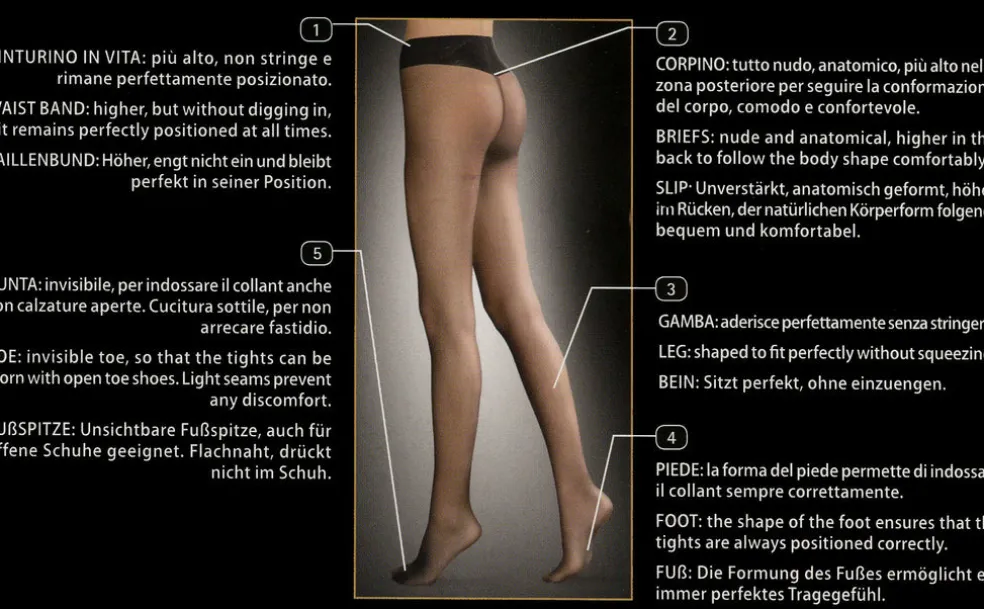 Fully Boarded Legs That Cling To Every Contour Of Your Legs Leaving You A Tailored Fit Feeling. The Invisible Toes Are Perfect For Your Open Toed Shoes And With Light Seams To Prevent Any Discomfort. The Shape Of The Foot Ensures That The Hose Is Positioned Correctly Without Twisting.
